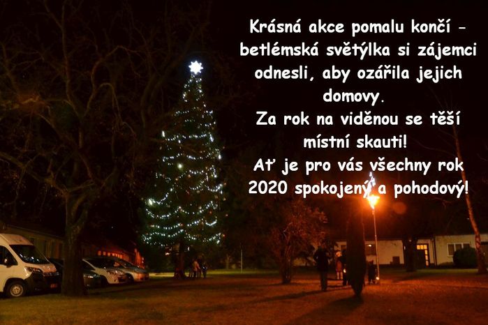 Stejně jako v letech předchozích se místní skauti postarali o to, aby se ke všem, kteří mají zájem, dostalo "Betlémské světlo". Několik desítek zájemců se sešlo v pondělí 23. prosince 2019 na náměstí Svobody, aby si toto poselství odnesli do svých domovů.