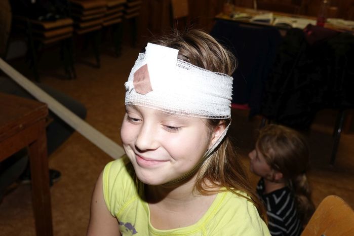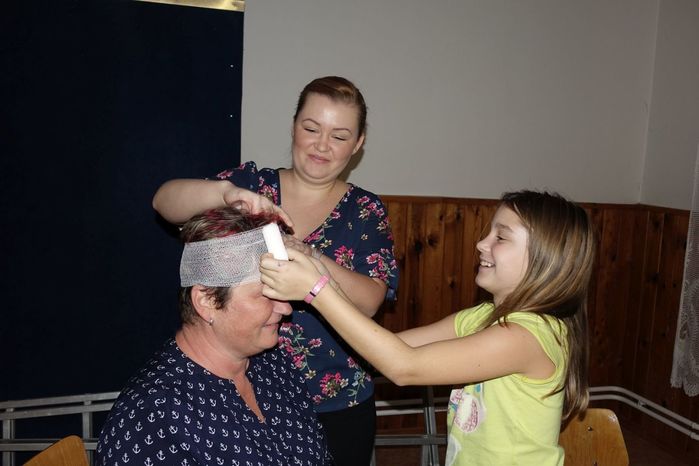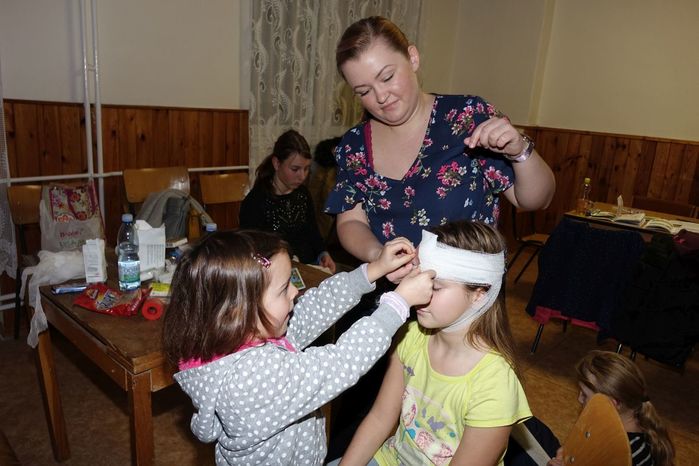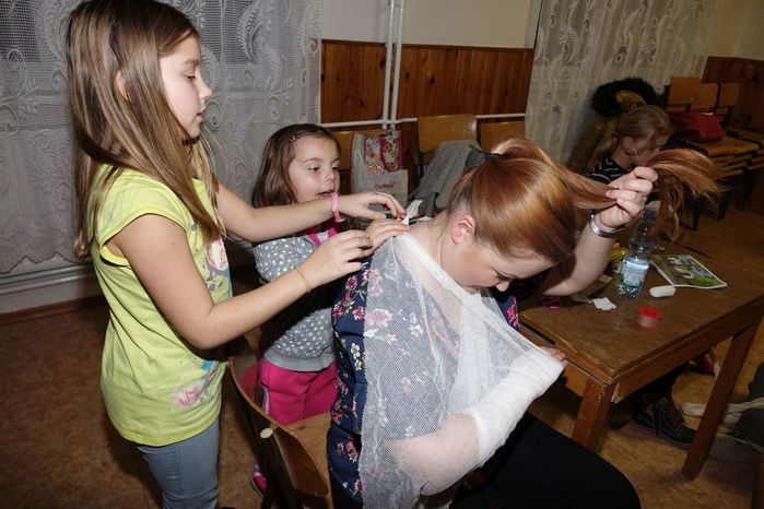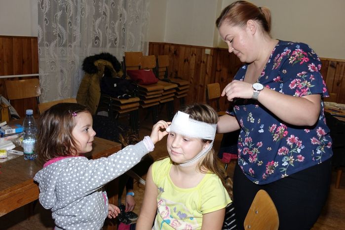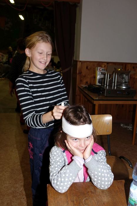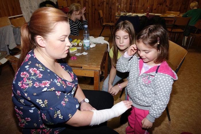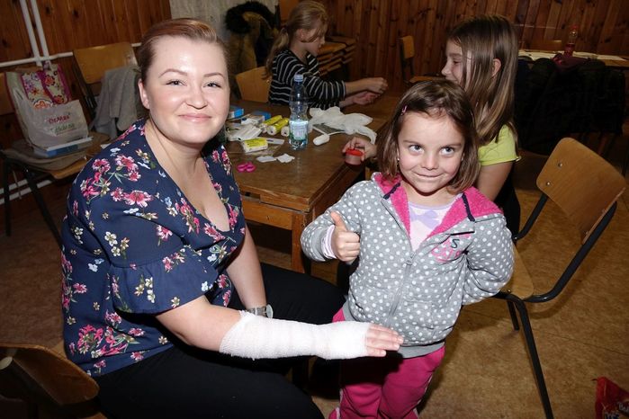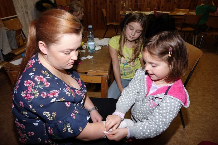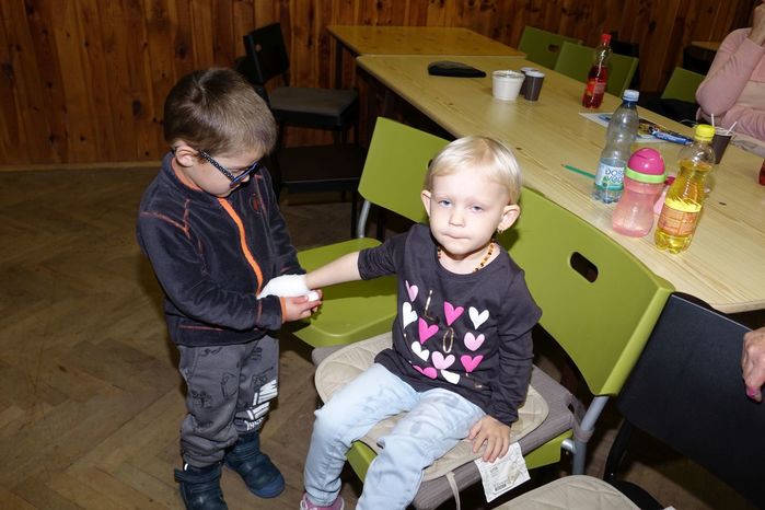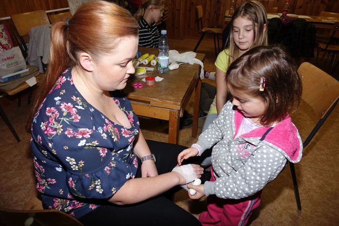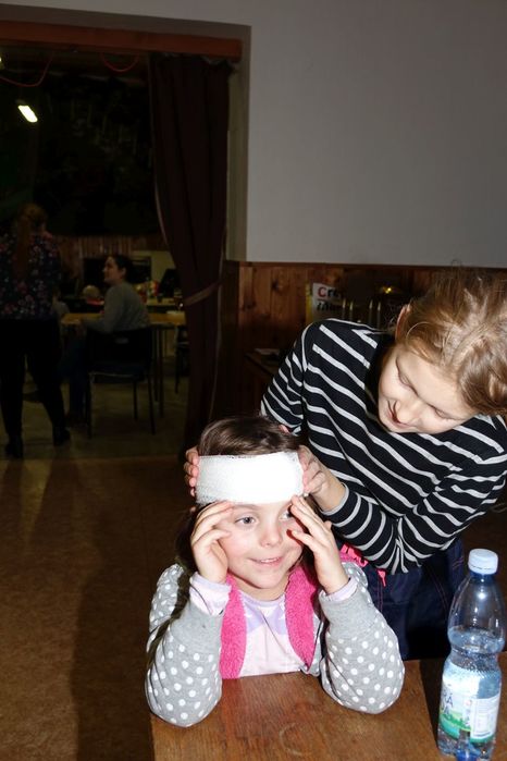 V kulturním domě byl připraven také koutek pro děti, protože co se v mládí naučíš...., však to znáte. Děti si nejprve kreslily, vymalovávaly omalovánky, ale jak uvidíte na fotografiích, aktivně se do kurzu také zapojily. A nutno podotknout, že se děti nenechaly zahanbit. Práce s obinadly jim šla od ruky, ať už to byli chlapci nebo dívky.