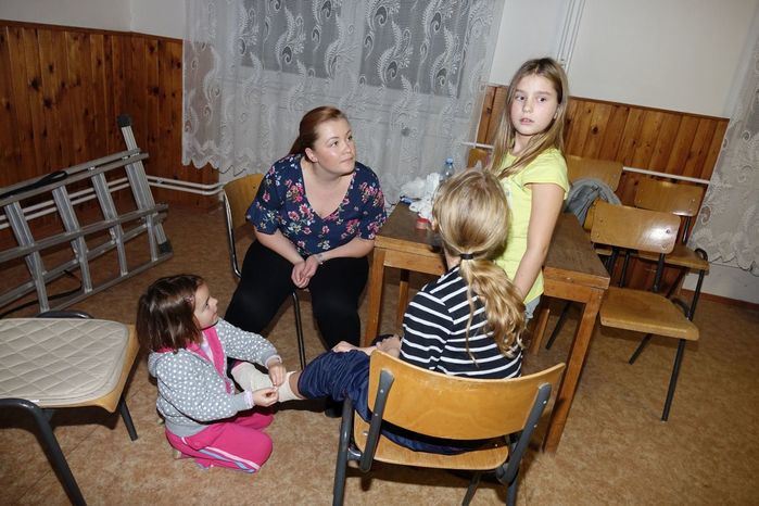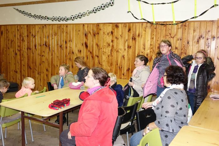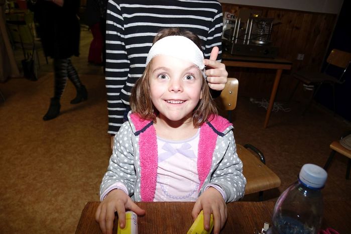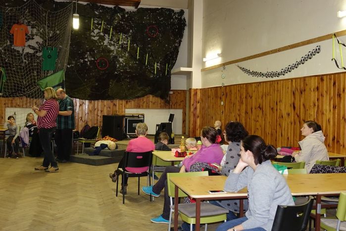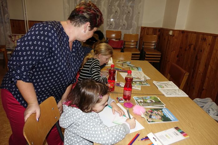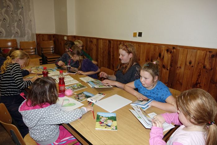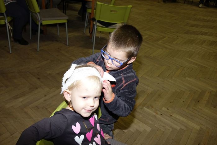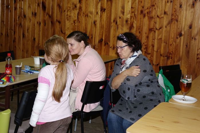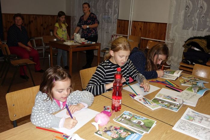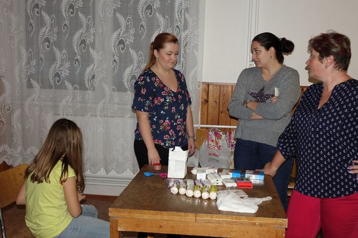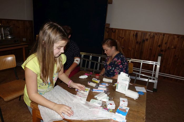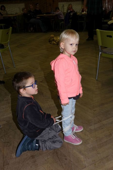 V kulturním domě byl připraven také koutek pro děti, protože co se v mládí naučíš...., však to znáte. Děti si nejprve kreslily, vymalovávaly omalovánky, ale jak uvidíte na fotografiích, aktivně se do kurzu také zapojily. A nutno podotknout, že se děti nenechaly zahanbit. Práce s obinadly jim šla od ruky, ať už to byli chlapci nebo dívky.