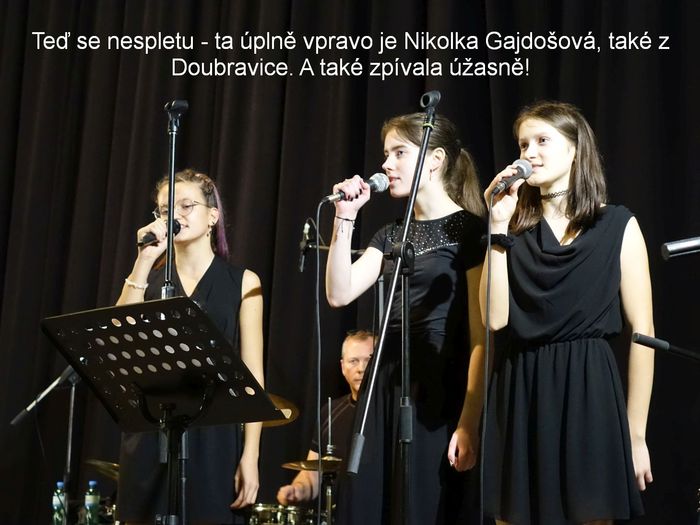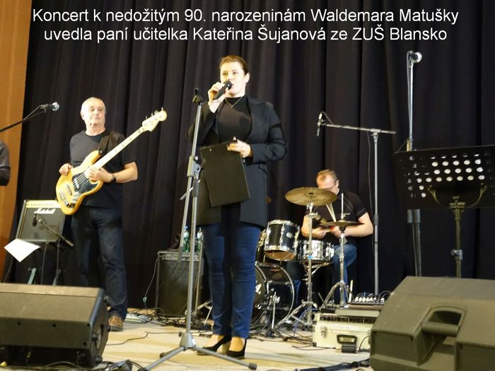 Většinou národa milovaný zpěvák Waldemar Matuška se nedožil svých devadesátých narozenin. V Doubravici vzpomínkový koncert zajistily členky ČČK. A dá se říct, že to byla trefa přímo do černého. Pravdou je, že všechna místa v místním kině nebyla obsazena, ale nebylo jich zase tak mnoho. Koho odradilo dosti nepříjemné počasí, které v pátek 4. listopadu panovalo, může ho to mrzet. Opravdu. Skvělí muzikanti, skvělí zpěváci - atnmosféra na jedničku. Škoda, že fotografie nejsou zvukové. Ale i tak si je prohlédněte.