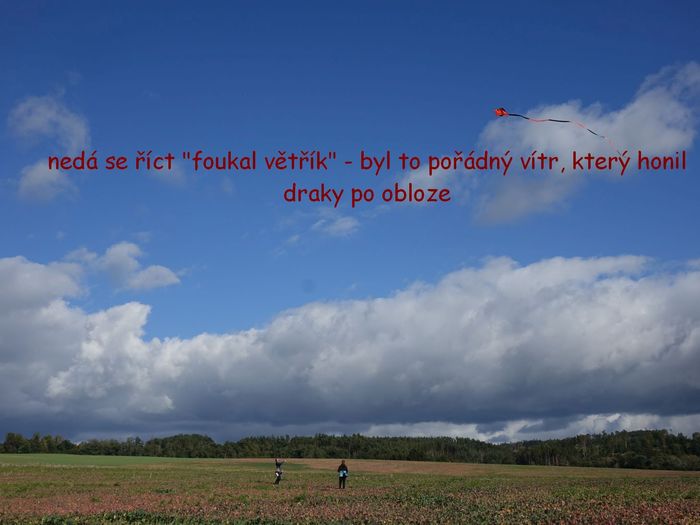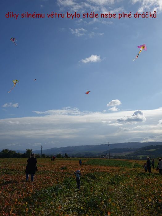 Když u cesty z Doubravice směr Újezd dozrávají šípky je to znamení, že je nejvyšší čas uspořádat DRAKIÁDU. Takto určitě přemýšlely členky MS ČČK Doubravice nad Svitavou. Sobota 7. října po ránu neslibovala počasí nic moc. Budou lítat, nebudou lítat, bude pršet, nebude pršet - tolik otázek musely řešit a nakonec se počasí umoudřilo, dětí se sešlo více jak dvě desítky, draků také tak a bylo z toho krásné odpoledne. Tak se pojďte podívat do fotogalerie, jak se letošní DRAKIÁDA vydařila.