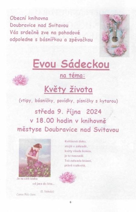 Je to neuvěřitelné, ale již deset let uplynulo od doby, kdy naši knihovnu navštívila spisovatelka, básnířka a zpěvačka v jedné osobě - Eva Sádecká (rodačka z Rájce-Jestřebí). Téměř dvě hodiny nám povídala o svojí práci, četla nové povídky, básničky a to vše prokládala krásnými písničkami. Jednou větou - krásný podvečer v místní knihovně.