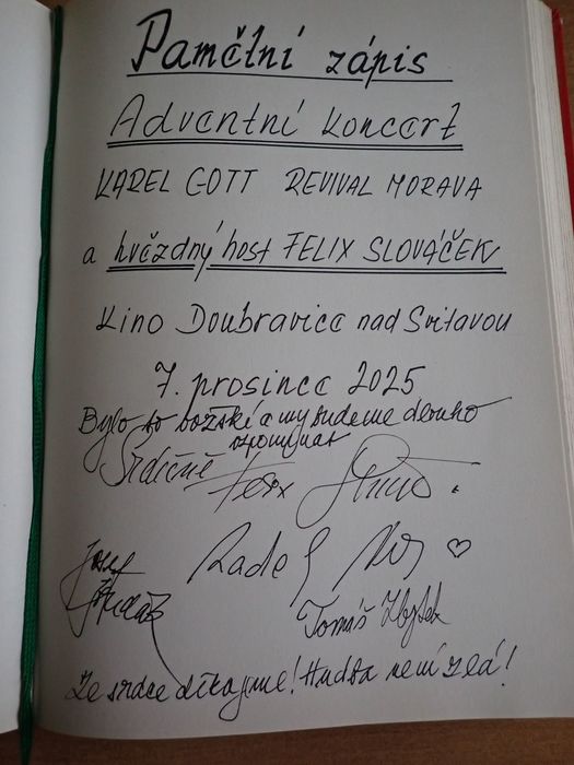 Byla to šťastná volba! Ptáte se v čem a proč? Odpověď jednoduchá. Vzpomenete si, kdy naposled se tady u nás konal "Adventní koncert"? Přiznávám, já ne. Vybrat takovou sestavu hudebníků na adventní koncert, to byla opravdu šťastná volba. KAREL GOTT REVIVAL MORAVA - už jsme je zde viděli a slyšeli, a když se k nim přidal FELIX SLOVÁČEK - co k tomu dodat. Nemyslím si, že se v nedělní podvečer 7.12. našel v sále kina jediný člověk, který by nebyl spokojen.